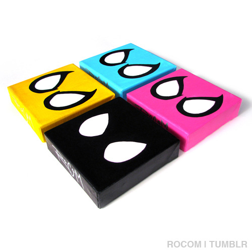 Spider-Man has been given the CMYK treatment in these four vibrant 6” X 6” painted canvases by ROCOM. They are now available on Etsy.