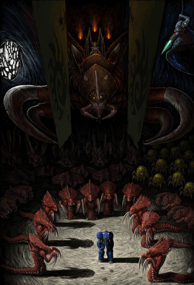 The lone Marine has got his work cut out for him in this killer StarCraft II fan art by Gilgamesh Jun Mao. He may need backup.