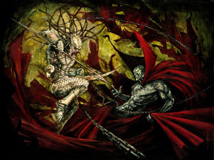 Two furious warriors, Spawn and Predator, go head to head in this awesome fan art mash up by Miko Maciaszek. “Get to da choppa!”