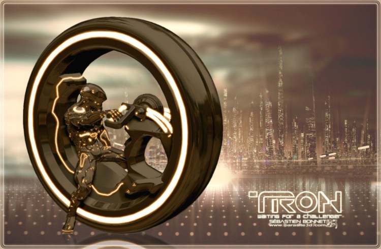 Upgraded Rinzler awaits the next challenger’s arrival on his killer new ride. This Star Wars (General Grievous) inspired wheel bike and Rinzler redesign were both created by artist Sebastien Bonnet.