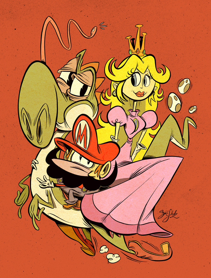 Yoshi, Mario and Princess Peach go for a cruise through Mushroom Kingdom in Dirk Erik Schulz’s amazing illustration. Such a cool style!