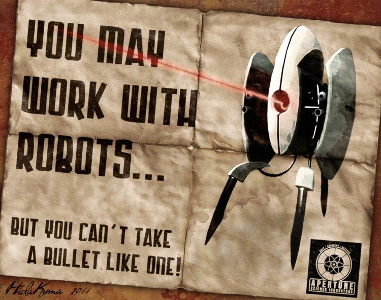 The turrets in Portal are fun to pester and push around, but they can also ruin your day. Rad fan art piece from the game by Hida Kuma . “Are you still there?”