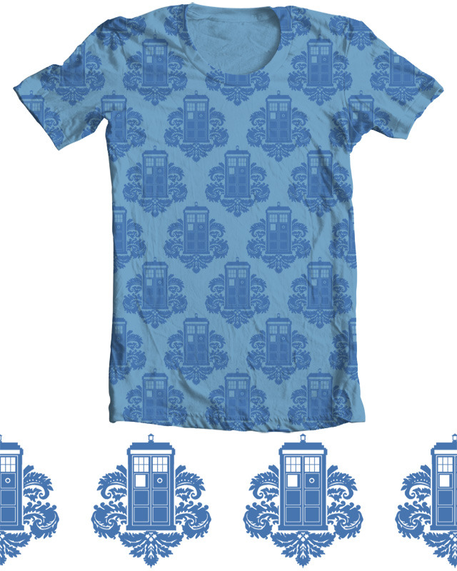 Artist Rosemary Travale recently created a Doctor Who / Damask style wallpaper and now it’s a shirt design up for voting over at Threadless!