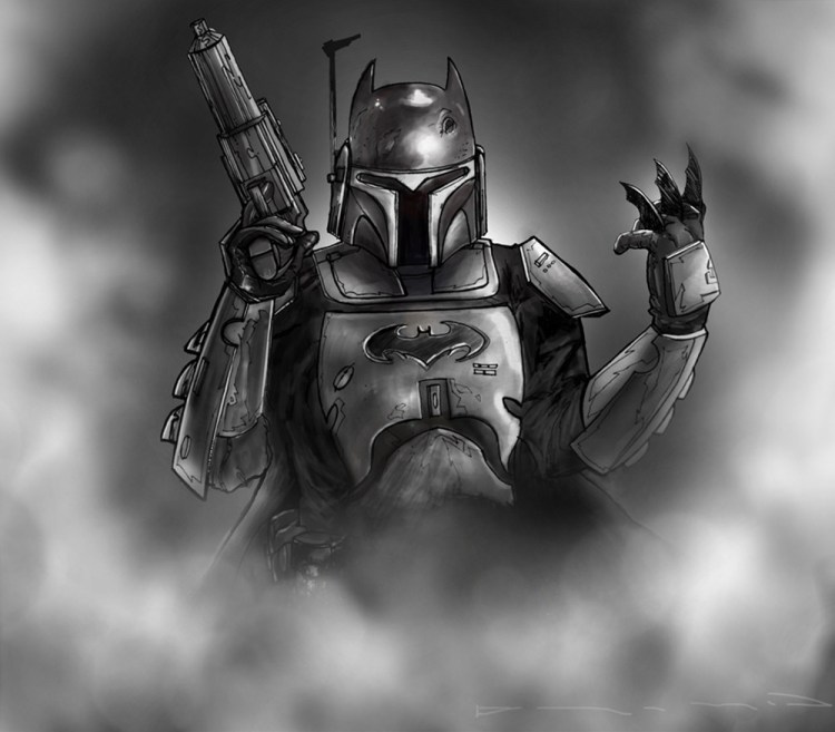 Batman and Boba Fett as one makes for one high tech bounty hunter. Plinio Pinto created this amazing Star Wars / Batman mash up for Draw2d2.