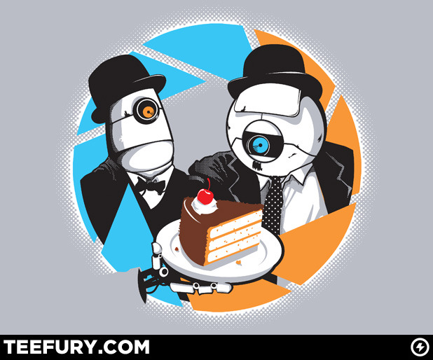 The robotic Portal 2 comedy team ATLAS and P-body take on the form of Laurel & Hardy in Steven Tu’s new shirt at TeeFury. On sale today (6/18).