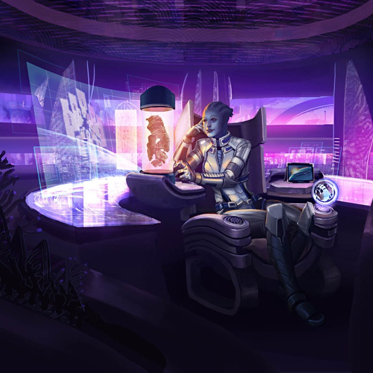 Liara T’Soni views old Prothean relics in Jessie Lam’s new rockin’ Mass Effect illustration. Created for an article at NerdAppropriate.