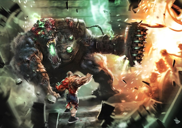 Rick takes on a death dealing robot gorilla in this Splatterhouse artwork by Dave Wilkins. It all started from a robot gorilla sketch by his friend Jeff Merghart.