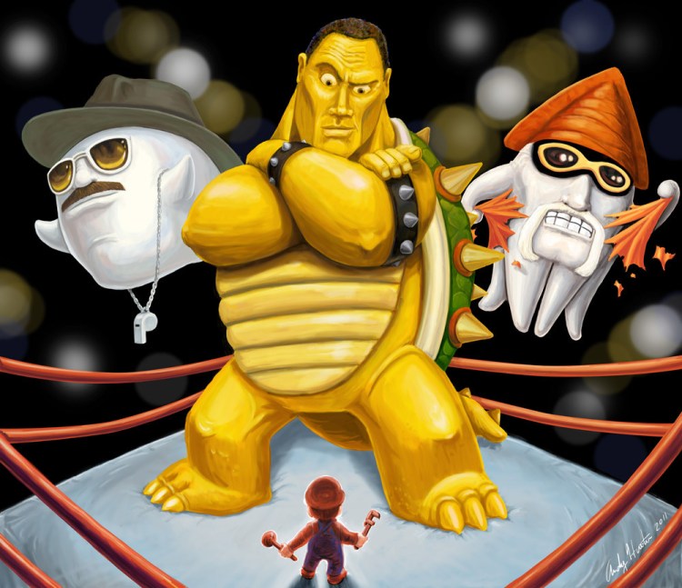 Mario takes on three great WWF / WWE wrestlers in this awesome mash up by artist Andy J Hunter. Do you smell what the King Koopa is cooking?