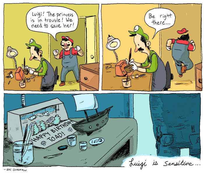 Luigi might not be a hardcore goomba stomping individual like Mario, but he will always be there for his pals when they need him. Check out more of Zac Gorman’s rad comics here on Tumblr!