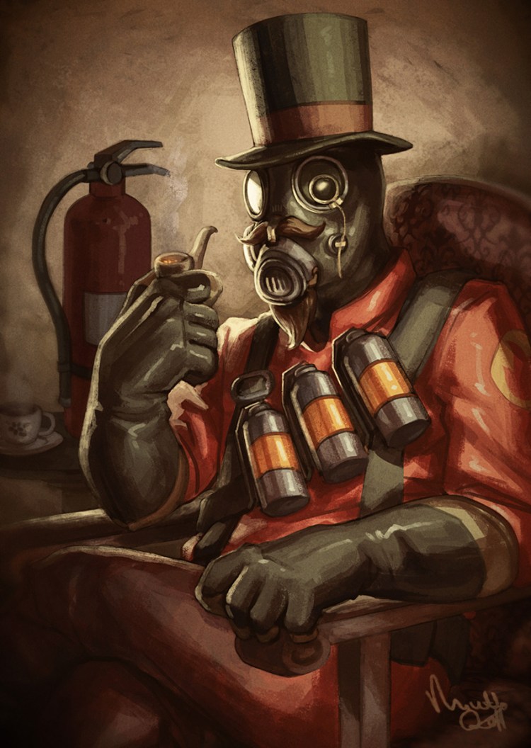 Not all Team Fortress Pyros are fire breathing monsters! Take Minttu Hynninen’s “Whiskered Gentleman” commission piece for example.