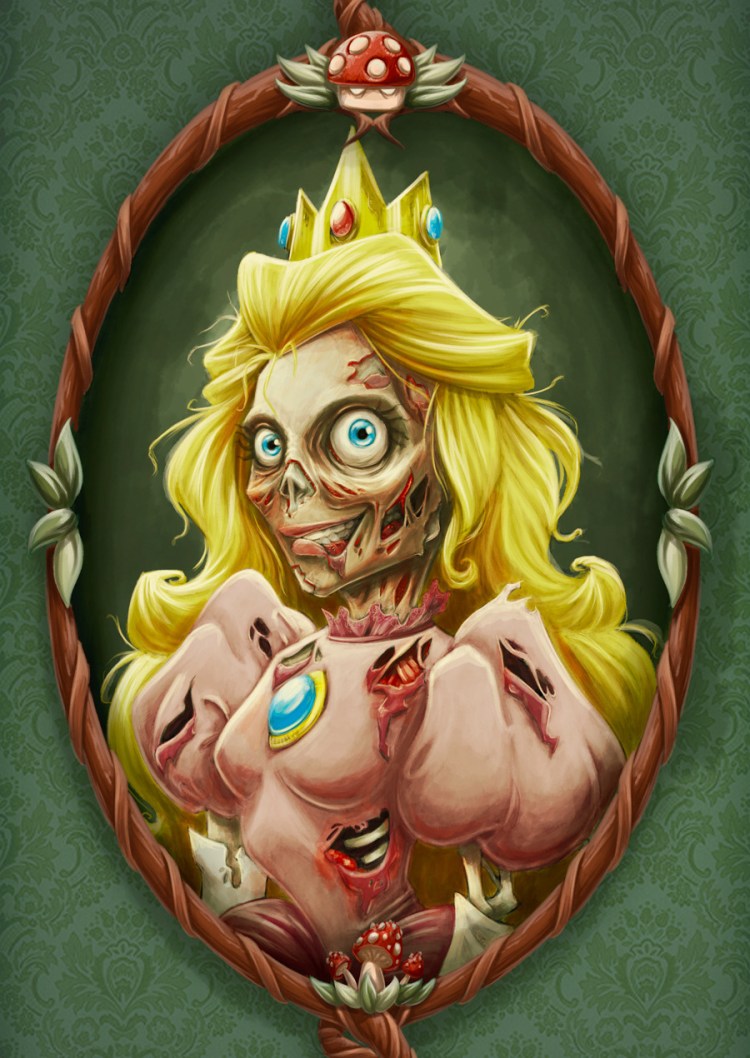 Zombie Princess Peach takes a break from her brain eating schedule to snap a lovely portrait for the photo album. Killer illustration by Amanda Dockery.