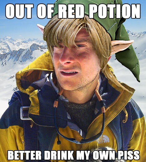 There are a lot of the “Bear Grylls / Better Drink My Own Piss” memes on the webs, but this Zelda themed version got me laughing.