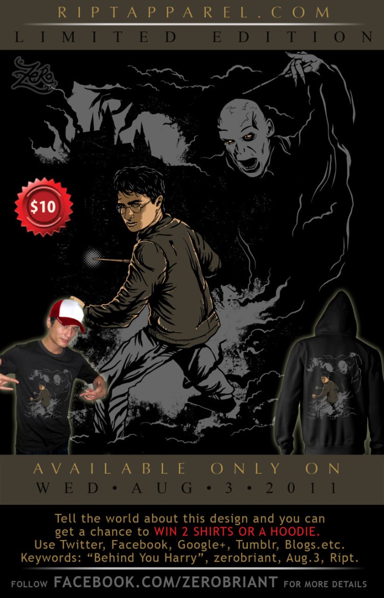 Tweet: “Get the final battle shirt of #HarryPotter “Behind you!” at @RIPT Apparel Wednesday (8/3) by @zerobriant”.