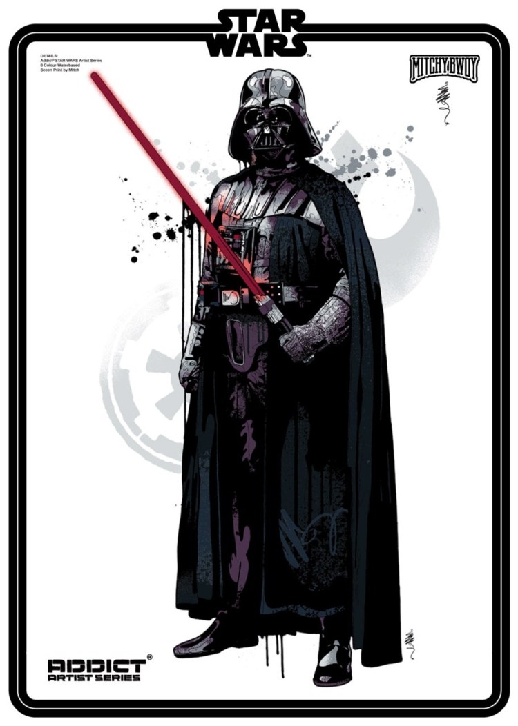 Three stylized Star Wars illustrations by Mitchy Bwoy that are coming soon to Addict Clothing for purchase. The force is strong with these designs.