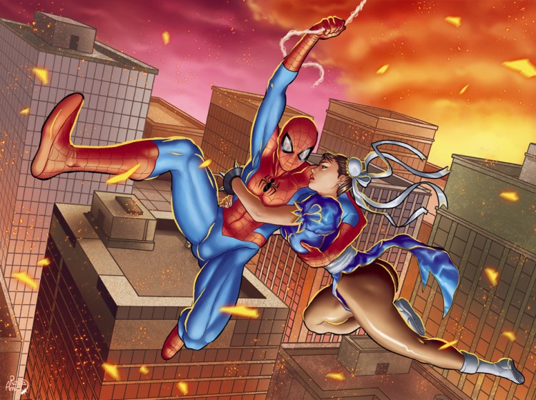 Chun-Li and Spidey take a trip through town in this Marvel vs. Capcom date night illustration by Rosita Amici. Watch those hands young man!