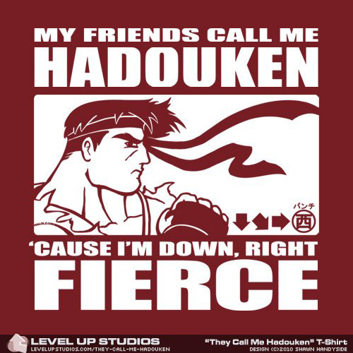 A fun submission to HALOLZ by Shawn Handyside quickly became an ass kicking shirt design. Now back in stock at Level Up Studios. Hadouken!