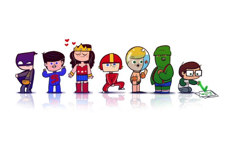 The Justice League assembles as little toddlers in this hilarious illustration by Justin White. Prints are available at inPRNT.