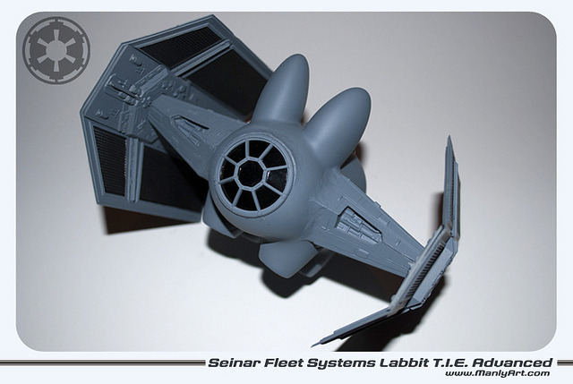 “One of the custom toys I will be selling at the Vinyl Thoughts Custom Vinyl Toy Art Show next month in Dallas. This is a mash-up of a 1978 MPC Darth Vader’s TIE Fighter model kit and a KidRobot Labbit.” – Jason