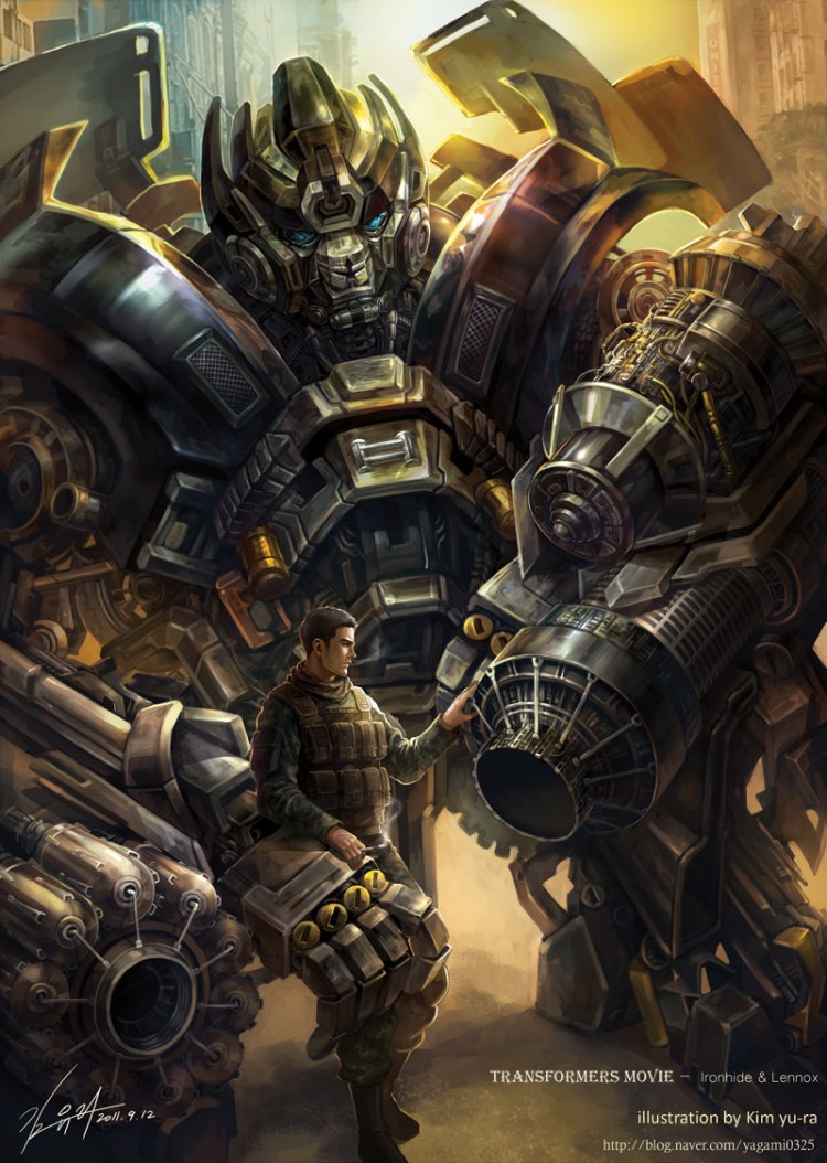 The heavily weaponized / hard ass Transformer Ironhide towers over Captain Lennox in Kim Yu-ra’s new fan art illustration.