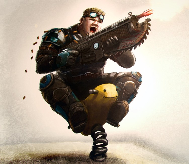Baird finds time to goof off, even as Locust hordes ravage the planet. Hilarious entry by artist Gary Storkamp for the “Gears/Artists United” contest going on now at deviantART. Get the full size wallpaper here.