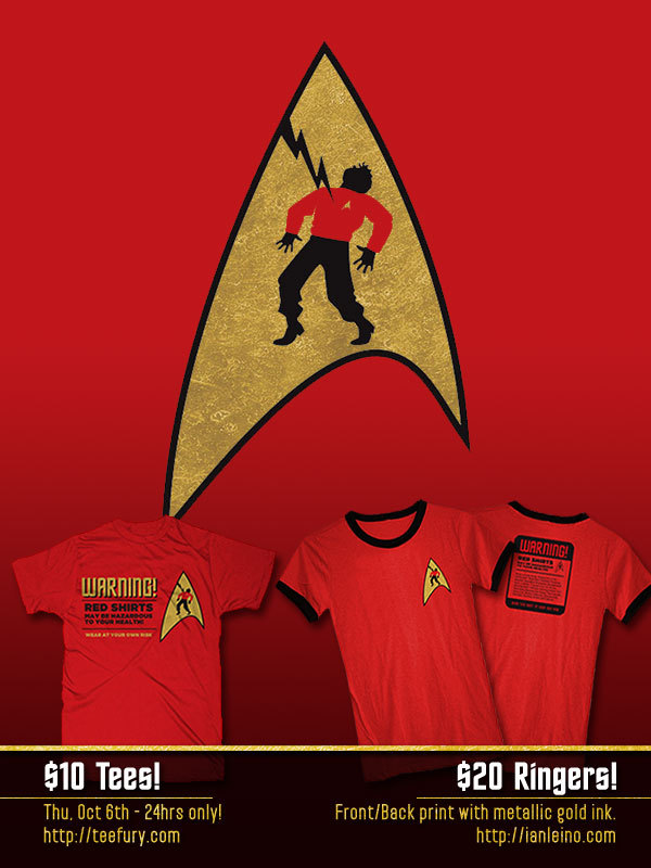 Take the role of a Redshirt thanks to Ian Leino. Don’t worry though… His shirts come with a warning label! On sale Thursday (10/6) for $10 at TeeFury!