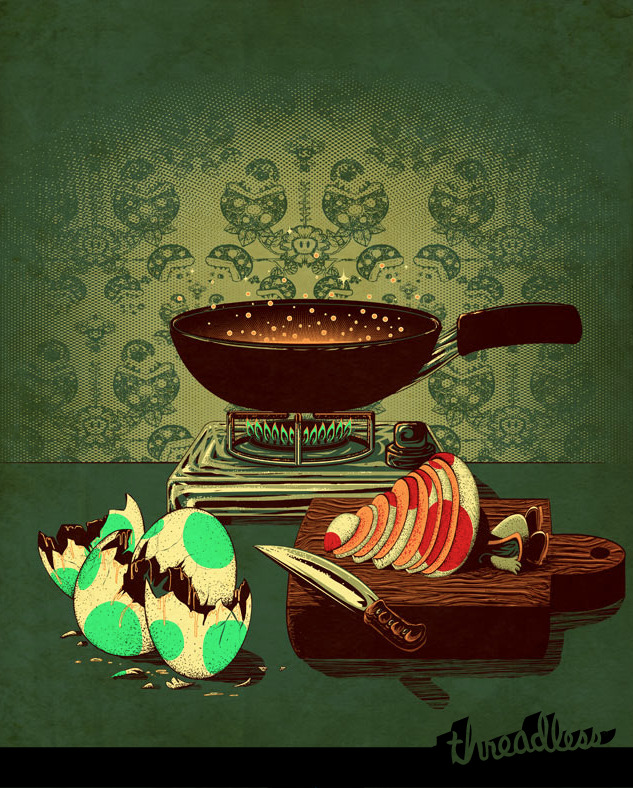 Before an all night gaming session, make sure to take in a well balanced Mario meal. Vincent Bocognani’s shirt design is now up for vote at Threadless.
