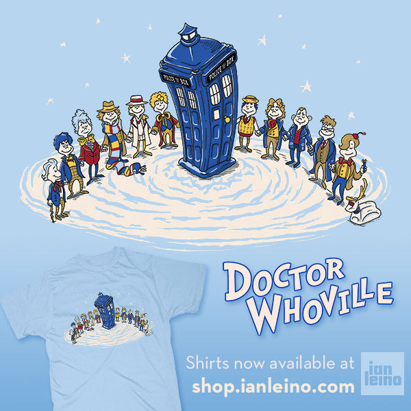 The eleven Doctors of Whoville gather around in Ian Leino’s new Dr. Seuss / Dr. Who mash up shirt design. Now on sale at his online store for $20.
