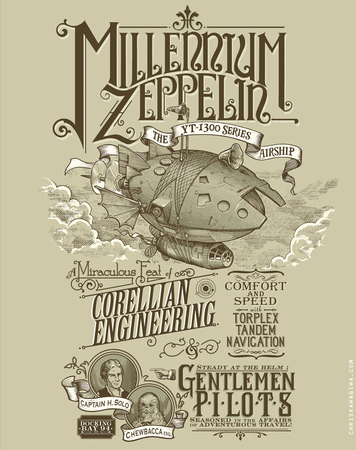 Talented artist Chris Kawagiwa created a great Victorian / Steampunk style ad for the Star Wars dynamic duo Han & Chewie. This design is now available in shirt form over at Mighty Fine. Check out the design process video here.