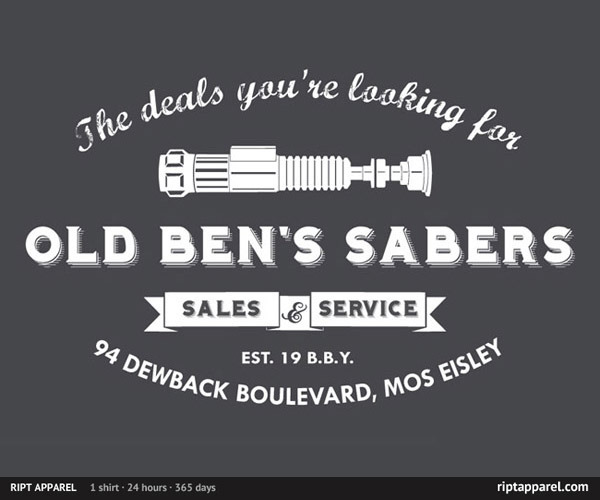 Old Ben Kenobi ran a Lightsaber shop before teaming up with young Luke. Steve Thomas’ new shirt design is proof! On sale Saturday (11/19) at RIPT.