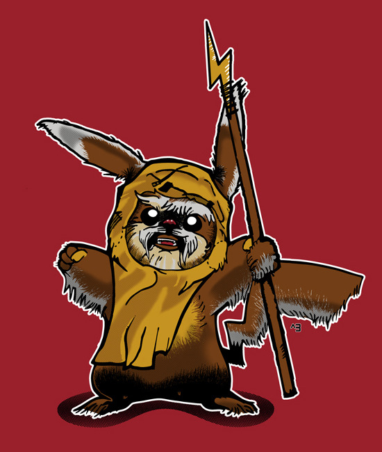 First PikaChewie and now PokEwok! The Star Was Galaxy gets a new Pokemon remix in Rob Wood’s rad shirt design.