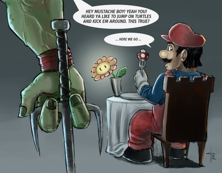 Mario’s turtle stomping days are coming to a quick end, if Raph has anything to do with it. Hilarious mash up by Tumblr artist J.P. Perez.