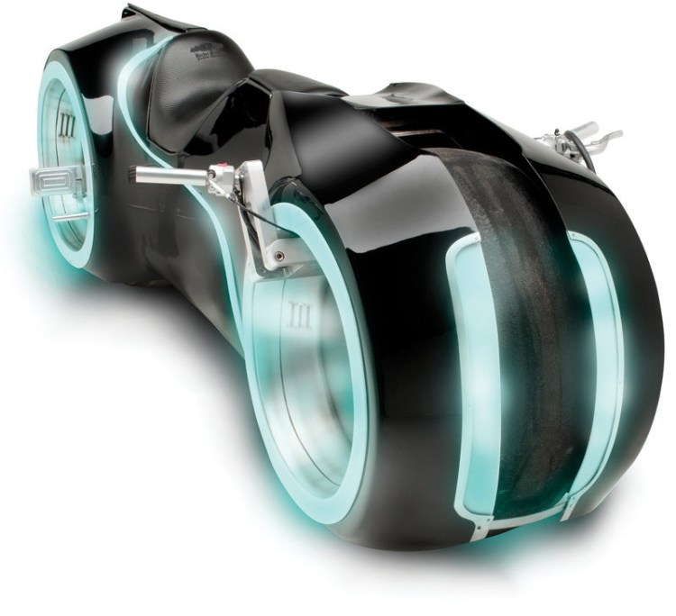 “This is the illuminated, street-legal motorcycle inspired by the computer animated cycle from the 2010 film Tron: Legacy. Designed for casual cruising and slow ride-bys at shows, it is made from a steel frame covered by a fiberglass cowling that replicates the sleek look of its computer-generated imagery counterpart.”