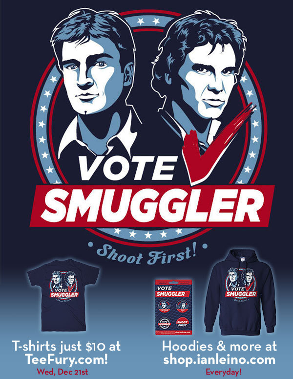 The heroes of Firefly and Star Wars team up to bring a better tomorrow to the galaxy (in their own crazy ways). Ian Leino’s excellent political smuggler shirt is on sale for RedBubble. Hoodies and more are also available at his personal online store. Remember, vote smuggler!