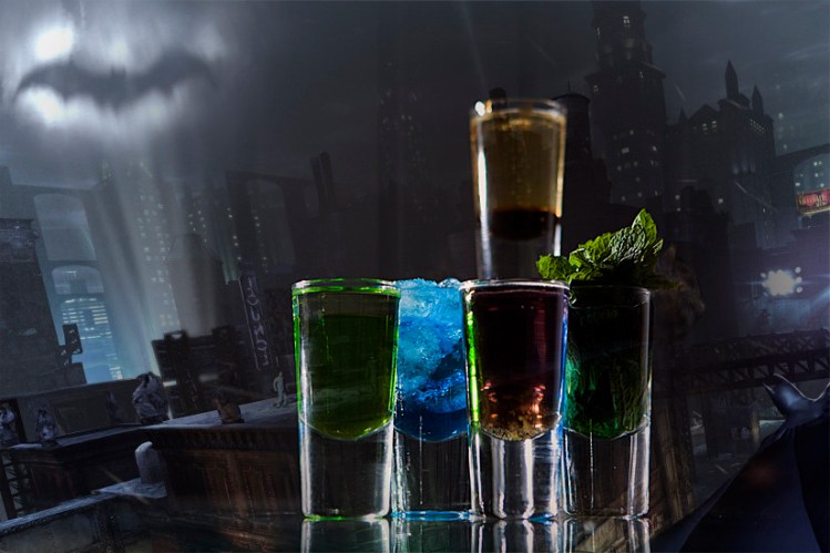 “This shot set sees some of Gotham’s most dastardly villains taking on the Dark Knight. For The Riddler, pour 20ml of Midori down the inside of glass, then add 5ml of vodka over a spoon. For a Mr Freeze, crush some ice and pour it into your shot glass, followed by 10ml of Blue Curacao and 10ml of Sambuca. Your Joker is made from 15ml Blue Curacao, cranberry juice and rum with a topping of popping candy (“You’ll need to stir it up with a straw to get the colour,” says James). Then we have a Poison Ivy, grown from 15ml of rum, a fresh mint leaf (or a dash crème de menth if you prefer) and sugar syrup. Finally, create your Batman/Bruce Wayne shooter with 5ml of blackcurrant coulis and champagne.“