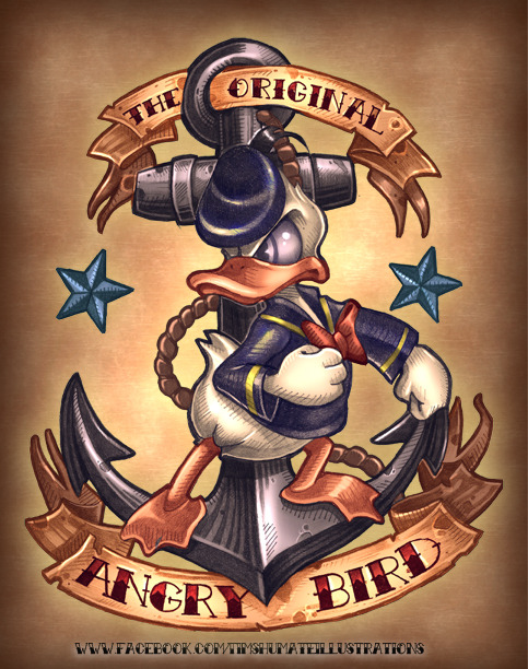 The ill tempered Donald Duck was the original Angry Bird! Those green pigs stood no chance against this feathered menace. Tim Shumate’s entered this mash up design for Threadless’ Donald Duck T-Shirt Design Challenge.