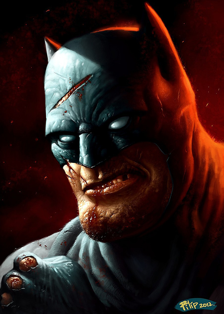 The bulky version of comic artist Frank Miller’s Dark Knight returns in this busted up tribute illustration by Filip Acovic. This is the goddamn Batman!