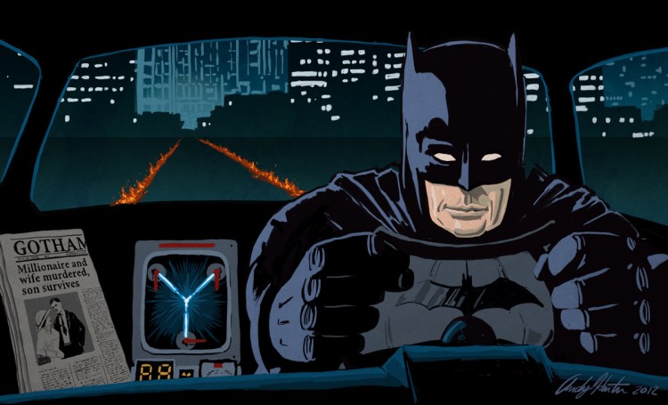 Great Scott… I mean Great Bruce! Batman has a little “Unfinished Business” to take care of in Andy Hunter’s new mash up illustration. Created for Draw2d2’s Back To The Future / Batman mash up theme.