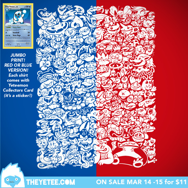 Artist Kari Fry did the collecting for you when creating her amazing original 151 Pokemon shirt design. On sale at The Yetee for $11 until March 15th! It even comes with a collectable LEGENDARY Yeteemon card (sticker)!