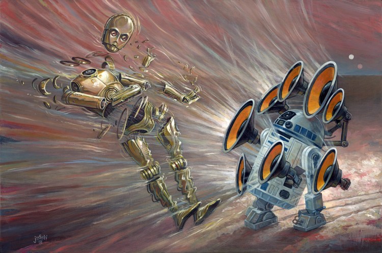 DJ C-3PO stood no chance against the hard hitting beats created by Artoo’s Droid Step (Dubstep) arsenal. Rad painting by Tumblr artist Aaron Jasinski!