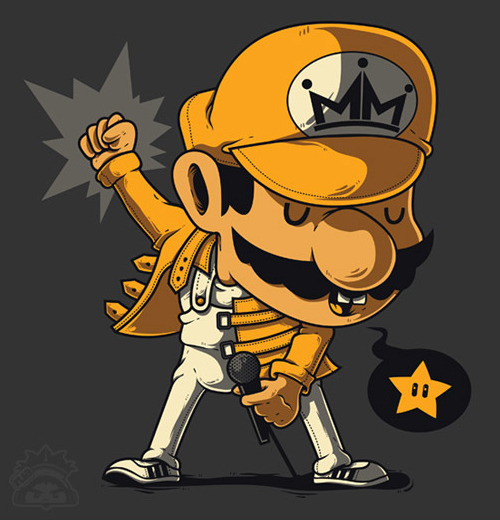 The epic lead singer of Queen (Freddie Mercury) and the leading Super Mario Brothers plumber (Mario) become one in this rockin’ shirt design by Philippine artist Rua Bloodrust. Vote it up at Threadless to see it go to print.