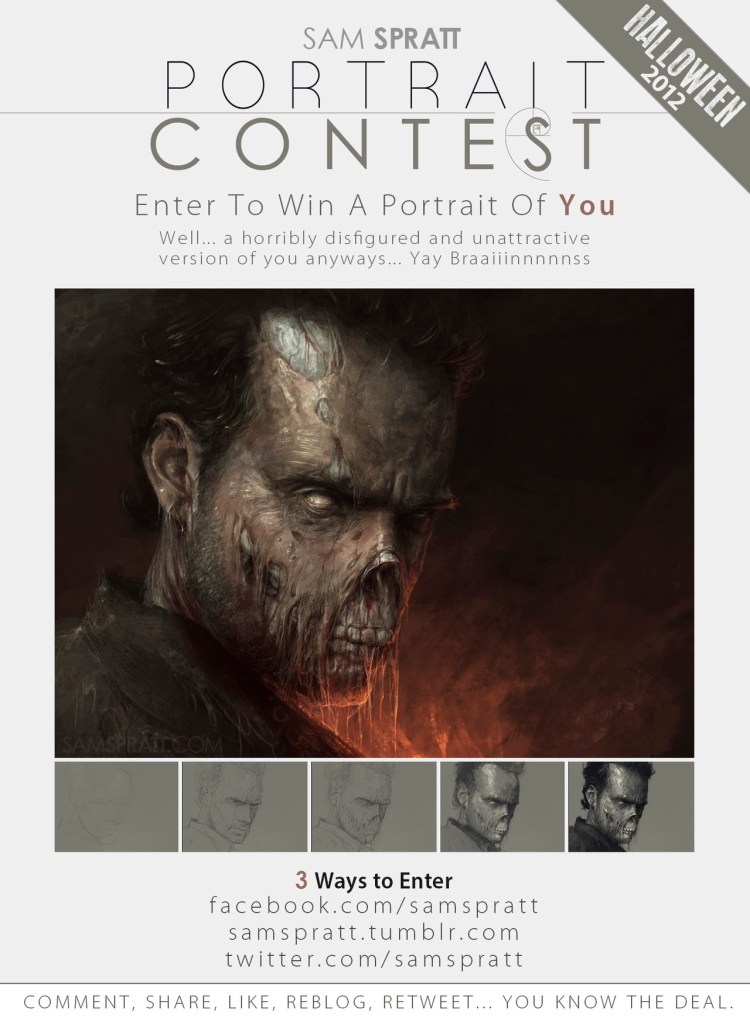 Twitter: Following @samspratt and tweeting “Entering to win a portrait of myself drawn as the undead by @samspratt! http://on.fb.me/RPNehj”
