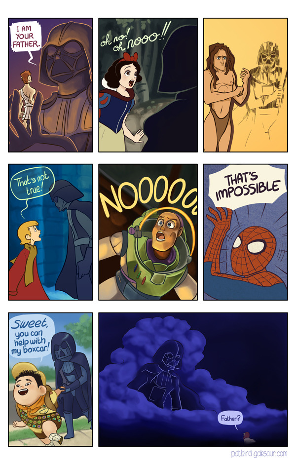 Ann Arbor, Michigan animator Gale Williams created an illustrated comic titled Nooooooooo (relating to the recent Disney purchase of Lucasfilm) that follows the Star Wars film villain Darth Vader as he tells various Disney owned characters “I am your father” and receives each of their reactions.