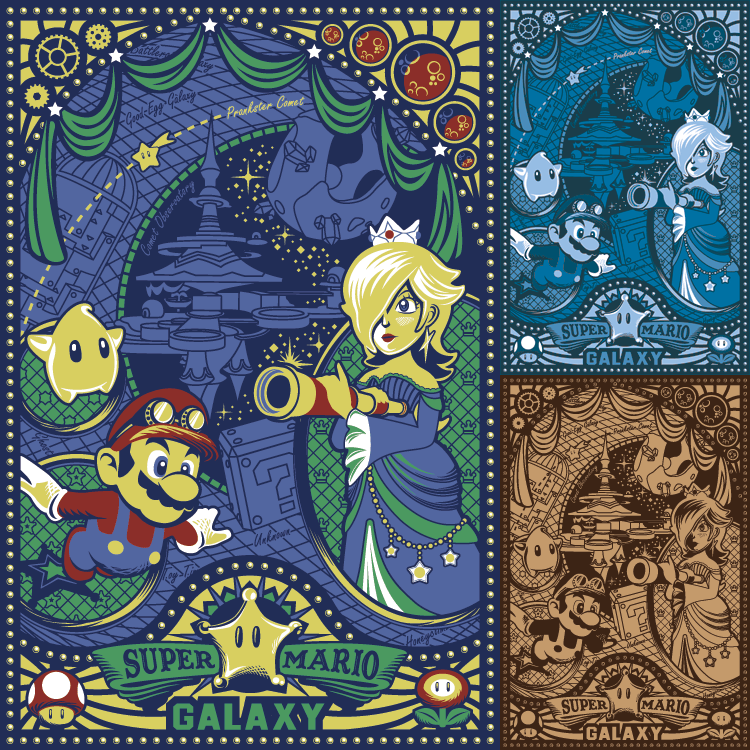 Mario Galaxy got a mesmerizing Steampunk / Victorian redesign in Amy Hollen’s gaming poster illustration.