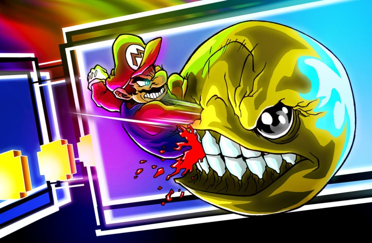 Mario never backs down from a good fight! Intense illustration of the Mushroom Kingdom hero taking on Pac-Man by Sebastian von Buchwald.